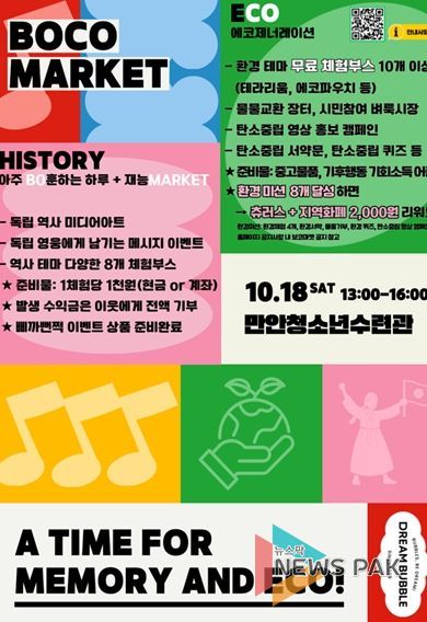 뉴스팍 배상미 기자 | 안양시청소년재단 소속 만안청소년수련관은 오는 10월 18일 청소년과 시민이 함께하는 ‘환경과 역사를 잇다 - BOCO MARKET & E-G 페스티벌’을 개최한다고 15일 밝혔다.