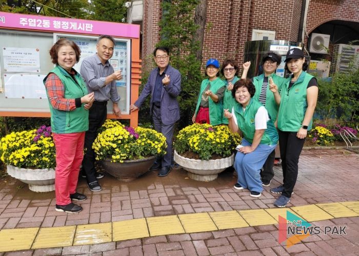 뉴스팍 배상미 기자 | 고양특례시 일산서구 주엽2동은 지난 10월 14일, 쾌적하고 아름다운 청사 환경을 조성하기 위해 청사 앞 화단과 화분에 국화를 식재했다고 밝혔다.