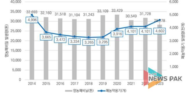 2023년 기준 경기도 영농폐기물 발생량은 영농 폐비닐이 약 3만 톤(93%), 폐농약 용기가 약 460만 개(94%)로 나타났다.