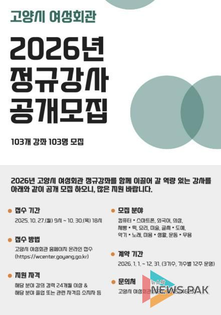 뉴스팍 배상미 기자 | 고양특례시 여성회관에서 2026년 정규강좌 운영을 위한 정규강사진을 공개 모집한다.