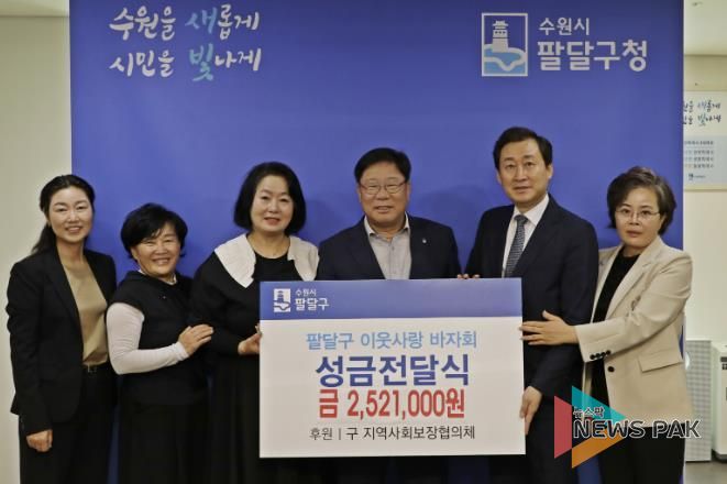 뉴스팍 배상미 기자 | 수원시 팔달구와 구 지역사회보장협의체는 지난 15일 구청장실에서 ‘팔달구 이웃사랑 바자회’ 성금 전달식을 가졌다.
