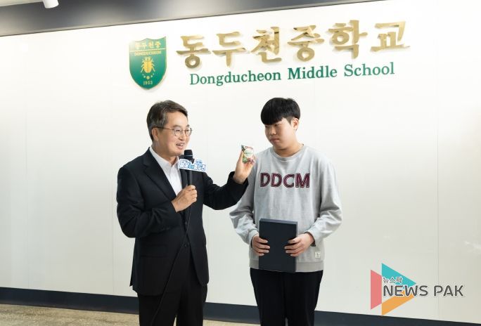 뉴스팍 배상미 기자 | 김동연 경기도지사가 16일 동두천중학교를 찾아 노점 할머니께 비상금을 건넨 선행으로 화제가 된 옥현일 군에게 표창을 수여했다.