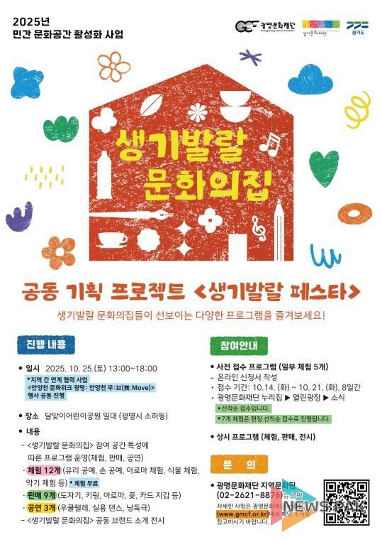 뉴스팍 배상미 기자 | (재)광명문화재단은 2025년 민간 문화공간 활성화 사업 '생기발랄 문화의집' 공동 기획 프로젝트 ‘생기발랄 페스타’를 10월 25일 오후 1시에 달맞이어린이공원에서 개최한다.