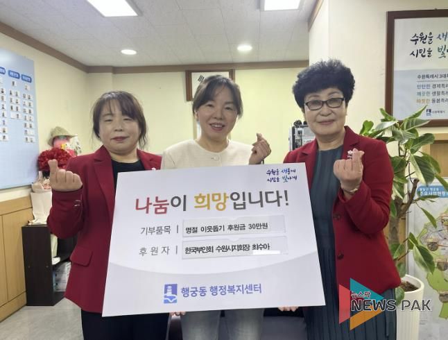 뉴스팍 배상미 기자 | 수원시 팔달구 행궁동은 지난 10월 16일 한국부인회 수원시지회로부터 어려운 이웃을 돕기 위한 사랑의 후원 쌀 100kg을 기탁받았다고 밝혔다.