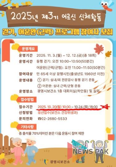 뉴스팍 배상미 기자 | 광명시 보건소는 지역 어르신들의 건강한 노후를 지원하기 위해 ‘2025년 제3기 어르신 신체활동 프로그램’을 오는 20일부터 23일까지 4일간 모집한다.