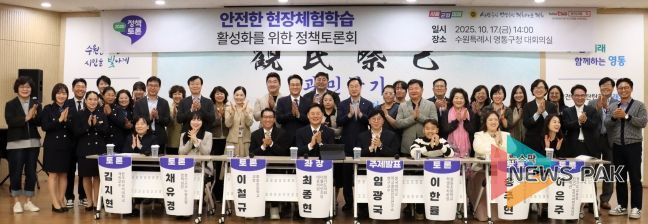 뉴스팍 배상미 기자 | 경기도의회 더불어민주당 최종현 대표의원(수원7)은 17일 영통구청 대회의실에서 열린 ‘안전한 현장체험학습 활성화’ 정책토론회에서 좌장을 맡아, 학교 현장의 안전한 현장체험학습을 위해 학부모·교사·학생·지자체의 역할을 함께 모색했다.