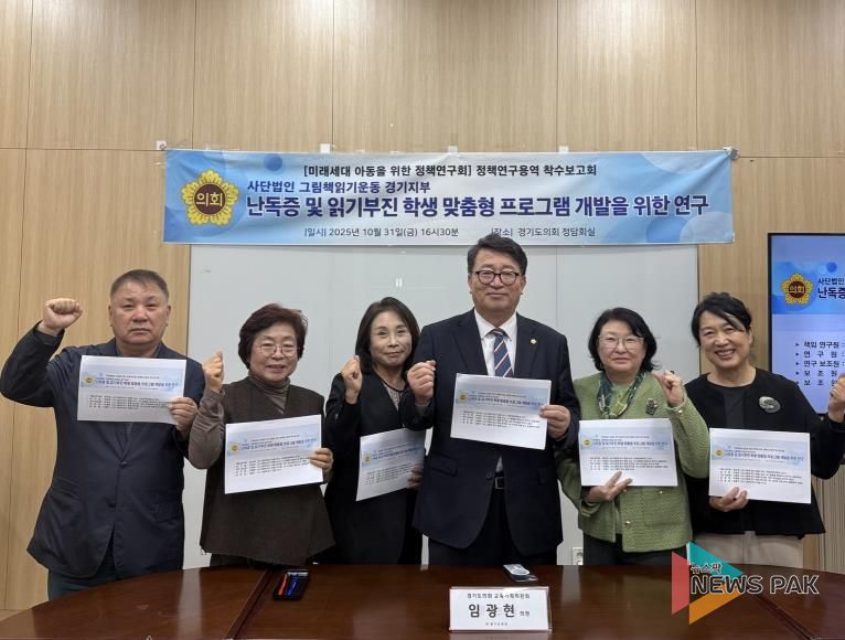 뉴스팍 배상미 기자 | 경기도의회 교육기획위원회 임광현 의원(국민의힘, 가평)은 31일 경기도의회 정담회실에서 '미래세대 아동을 위한 정책연구회(회장 임광현)'의 연구활동을 위해 ‘난독증 및 읽기부진학생 프로그램 개발 연구’ 착수보고회를 개최했다.