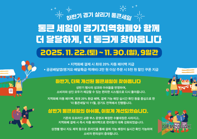 뉴스팍 배상미 기자 | 경기도시장상권진흥원(이하 경상원)은 ‘2025년 경기 살리기 통큰 세일(이하 통큰 세일)’ 상반기 성과를 발표하고, 자동 페이백 시스템 도입 등 편의성을 높인 하반기 추진 계획을 4일 밝혔다. 상반기 행사에서 참여 상권의 매출이 증가하고 소상공인과 소비자의 만족도가 높았던 만큼, 하반기 행사는 지역 경제 활성화에 더욱 기여할 것으로 기대된다.