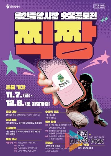 뉴스팍 배상미 기자 | 용인특례시는 용인중앙시장의 생동감과 매력을 짧은 영상으로 표현하는 용인중앙 숏폼 공모전 ‘찍짱’을 개최한다고 9일 밝혔다.