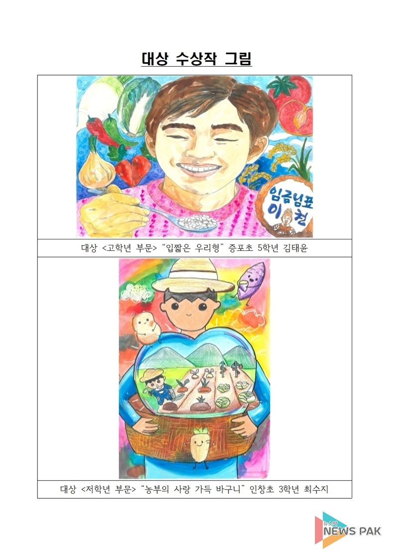 특히 고학년 부문 대상은 증포초 5학년 김태윤 학생의 “입짧은 우리 형”이 차지했다. 김 군은 농부의 정성과 소중한 우리 농산물 덕분에 입이 짧은 형이 즐겁게 식사하게 된 모습을 그림으로 표현하며 심사위원들의 높은 평가를 받았다. 저학년 부문 대상은 인창초 3학년 최수지 학생의 “농부의 사랑 가득 바구니”가 수상했다.
