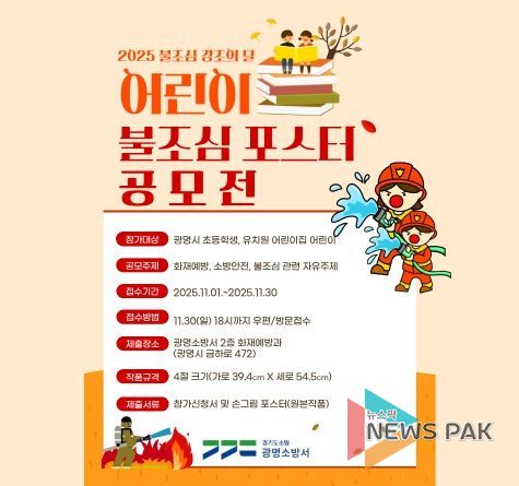 뉴스팍 배상미 기자 | 광명소방서는 ‘불조심 강조의 달’을 맞아 ‘2025 어린이 불조심 포스터 공모전’을 개최한다고 11일 밝혔다.