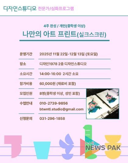 뉴스팍 배상미 기자 | 경기문화재단 경기상상캠퍼스는 2025년 디자인스튜디오 판화 집중 교육 프로그램으로 청소년·성인 대상의 〈나만의 아트 프린트〉와 초등학생 대상의 〈핸드 프린트 입문〉 강좌 수강생을 모집한다. 이번 교육은 경기문화재단이 추진하는 ‘생활 속 디자인 감수성 확장’ 사업의 일환으로, 도민이 일상에서 예술적 경험을 쌓을 수 있도록 기획됐다. 11월부터 12월까지 진행되는 이번 프로그램은 디자인스튜디오에서 처음 시도되는 판화 심화 교육 과정으로, 실크스크린과 핸드 프린트 두 가지 프로그램을 통해 판화 예술의 매력을 직접 체험할 수 있다.