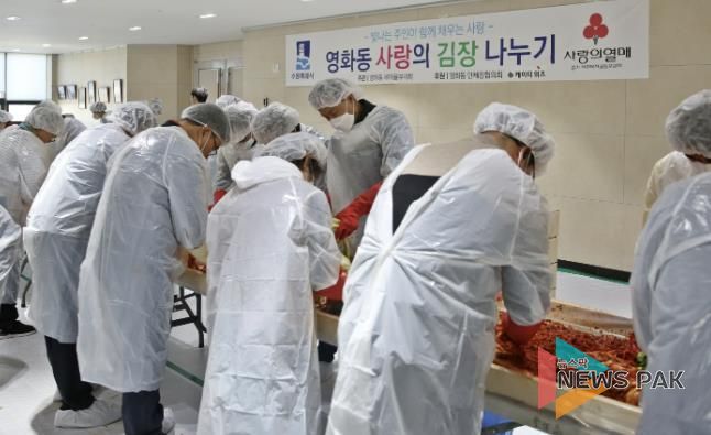 영화동 새마을부녀회, 새마을지도자협의회 등 단체원 50여 명이 한마음 한뜻으로 참여해 양념을 버무리며 김장김치를 담가 포장했다. 정성으로 버무려진 김장김치는 130여 세대에 전달되어 추운 겨울을 따뜻하게 맞이할 수 있도록 온기를 더했다.