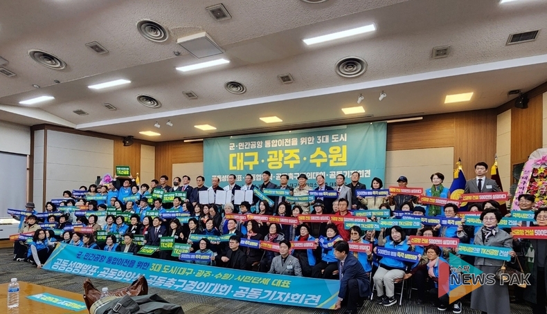 뉴스팍 류은정 기자 | 수십 년간 도시 발전의 걸림돌이자 시민들의 소음 피해를 유발했던 군 공항 및 민간 공항의 이전을 촉구하기 위해 수원특례시, 대구광역시, 광주광역시의 시민단체들이 한목소리를 냈다. 이들 3대 도시 시민단체들은 지난 11월 12일(수), 대구상공회의소 대강당에 모여 정부를 상대로 공항 통합 이전 사업의 조속한 추진을 요구하는 공동행동에 돌입했다.