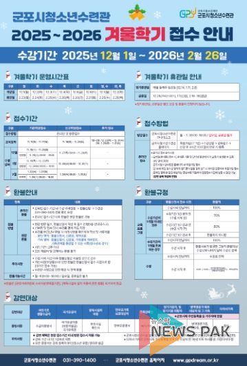 뉴스팍 배상미 기자 | 재)군포시청소년재단 군포시청소년수련관은 오는 12월 1일부터 2025년 2월 26일까지 겨울학기 문화체육 프로그램을 운영한다.