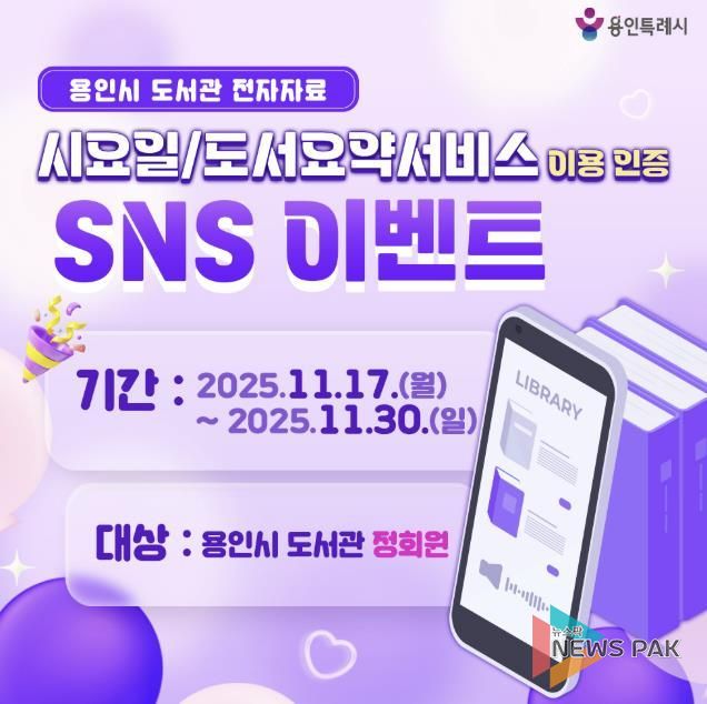 뉴스팍 배상미 기자 | 용인특례시는 용인시도서관 전자자료인 시요일과 도서요약서비스 이용자를 대상으로 사회관계망서비스(SNS) 이벤트를 운영한다고 14일 밝혔다.