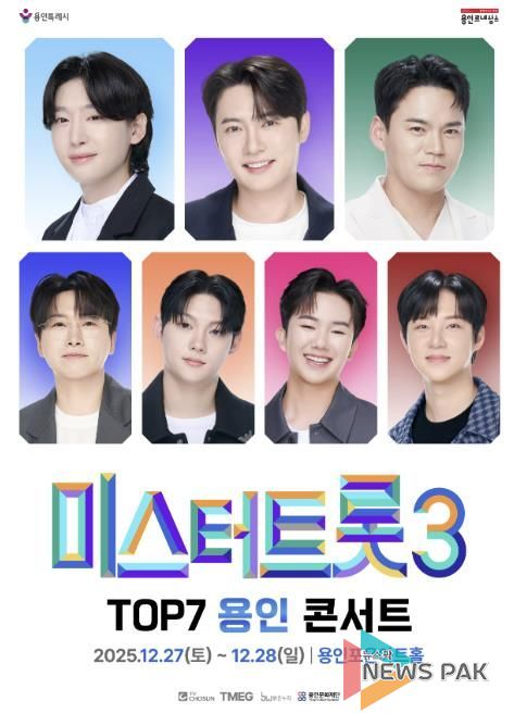 뉴스팍 배상미 기자 | 용인문화재단은 오는 12월 27일부터 28일까지 용인포은아트홀에서 ‘미스터트롯3 TOP7 콘서트’를 선보인다. 공연은 27일 오후 1시·6시, 28일 오후 1시 총 3회 진행된다.