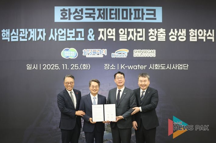 이날 김 지사는 정명근 화성시장, 임영록 신세계그룹 사장, 안정호 K-water 그린인프라부문장과 ‘화성 국제테마파크 지역 일자리 창출 및 상생협력 업무협약’을 체결했다.