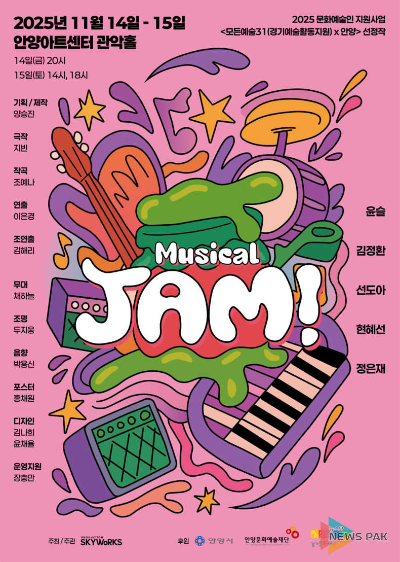 뉴스팍 배상미 기자 | 콘텐츠 제작사 (주)스카이웍스(Skyworks, 대표 양승진)가 제작한 창작 뮤지컬 <JAM!>이 지난 11월 14일과 15일 양일간 안양아트센터 관악홀에서 관객들의 뜨거운 호응 속에 초연을 마쳤다.