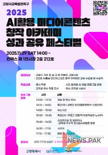 뉴스팍 배상미 기자 | 고양특례시는 오는 29일 킨텍스 제1전시장 212호에서 교육발전특구 사업의 일환으로 추진한 ‘2025 AI활용 미디어콘텐츠 창작 아카데미’의 성과를 시민들과 함께 나누는 페스티벌을 개최한다.