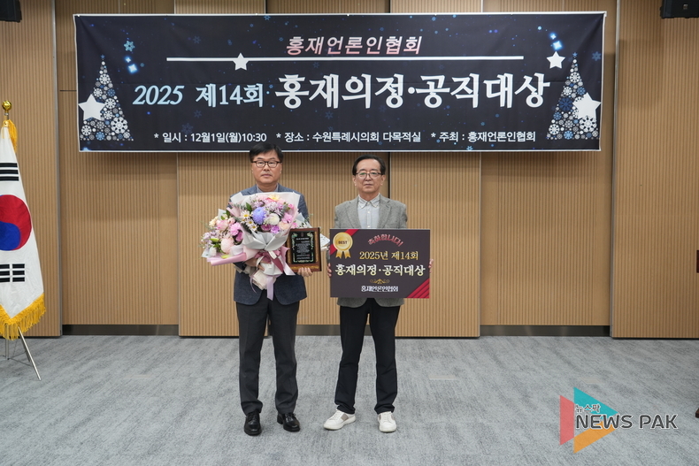 뉴스팍 배상미 기자 | 수원특례시의회 김주찬 지방행정사무관(의회사무국)이 제14회 홍재공직대상을 수상했다. 시상식은 홍재언론인협회(회장 윤청신) 주최로 12월 1일 오전 수원특례시의회 1층 다목적실에서 진행됐다.