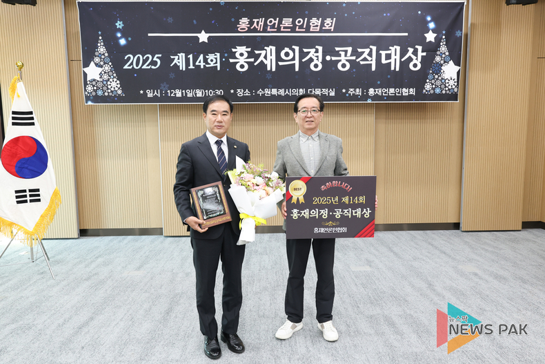 뉴스팍 배상미 기자 | 화성특례시의회 김상수 의원(국민의힘, 동탄7동,동탄8동,동탄9동)이 제14회 홍재의정대상을 수상했다. 시상식은 홍재언론인협회(회장 윤청신) 주최로 12월 1일 오전 수원시의회 신청사 다목적실에서 열렸다.