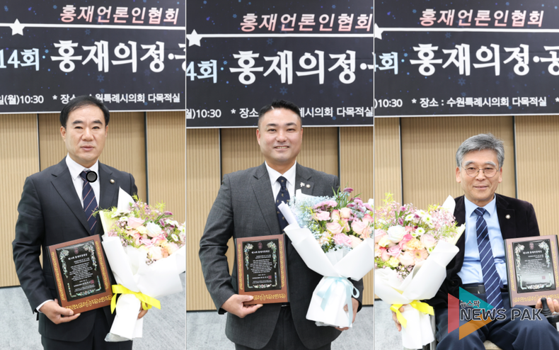뉴스팍 배상미 기자 | 화성특례시의회 소속 김상수, 김상균, 이용운 의원이 1일 수원특례시의회 신청사에서 열린 ‘제14회 홍재의정대상·공직대상 시상식’에서 홍재의정대상을 수상하는 영예를 안았다.