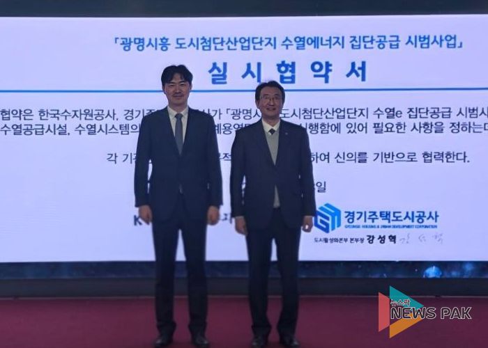 뉴스팍 배상미 기자 | 경기주택도시공사(GH)는 3일 GH 수원 본사 9층 역량개발센터에서 한국수자원공사(K-water)와 함께 ‘광명시흥 도시첨단산업단지 수열에너지 집단공급 시범사업’ 추진을 위한 실시협약을 체결했다고 밝혔다. 이 자리에는 양 기관 관계자 약 30명이 참석했다.