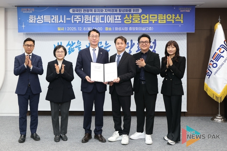 화성시는 최근 시청 접견실에서 ㈜현대디에프와 '화성시 관광 산업 활성화를 위한 상호 업무협약(MOU)'을 체결했다고 9일 밝혔다.