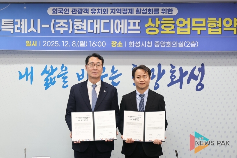 뉴스팍 배상미 기자 | 인구 100만 특례시 진입을 앞둔 경기 화성시가 서해안 대표 관광도시로의 도약을 위해 현대백화점면세점 운영사인 ㈜현대디에프와 손을 잡았다.