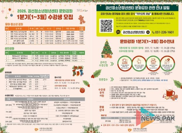 뉴스팍 배상미 기자 | 수원시청소년청년재단 권선청소년청년센터는 오는 1월 6일부터 3월 27일까지 지역사회 평생학습 문화강좌 1분기(1~3월) 수강생을 모집한다.