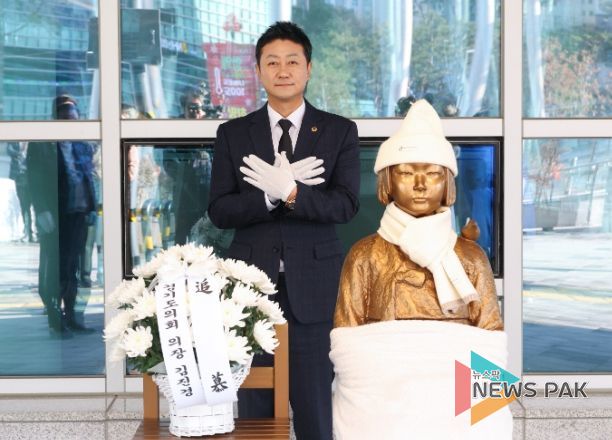 김 의장은 평화의 소녀상 앞에서 헌화와 묵념을 하며 피해자들의 희생을 가슴 깊이 되새겼다.