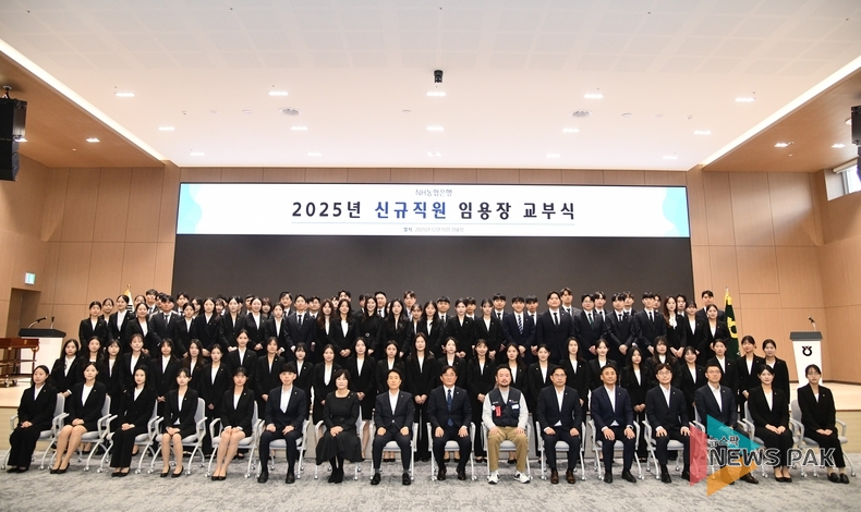 뉴스팍 배상미 기자 | NH농협은행 경기본부는 15일 대회의실에서 김성록 경기본부장, 김현일 경기노조위원장, 송해경 현장지원부장, 박정남 RM마케팅부장 등이 참석한 가운데‘2025년도 6급 신규직원 임용장 교부식’을 가졌다.