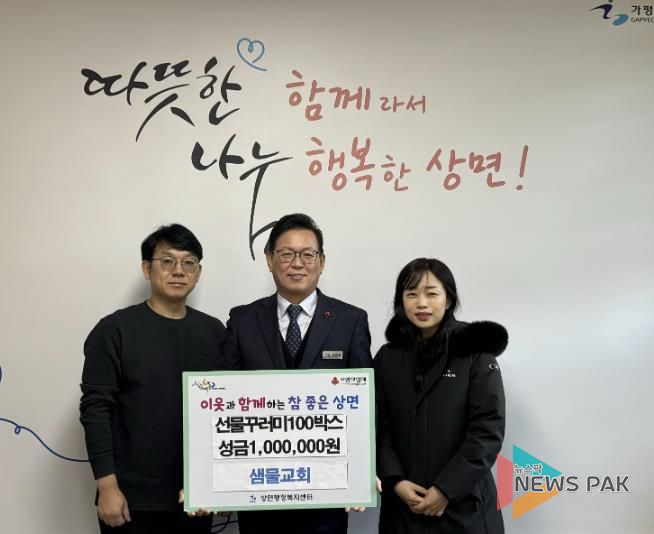 뉴스팍 배상미 기자 | 가평군 소재 샘물교회는 18일 상면 행정복지센터를 방문해 지역의 어려운 이웃을 위해 성금 100만원과 선물꾸러미 100세트를 기탁했다.