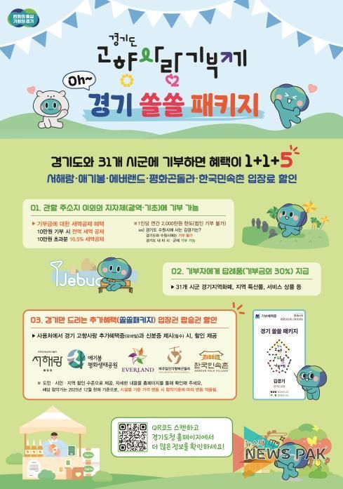 뉴스팍 배상미 기자 | 경기도가 고향사랑기부제 참여 확대와 지역경제 활성화를 위해 기부자에게 에버랜드, 한국민속촌 등 주요 관광시설 이용 할인 혜택을 제공한다.