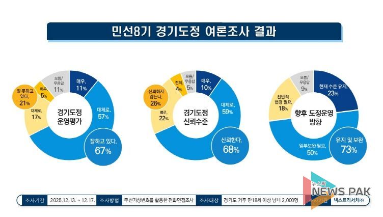 경기도가 여론조사 전문기관 넥스트리서치에 의뢰해 12월 실시한 여론조사 결과, 경기도정 운영을 ‘잘하고 있다’는 응답은 67%로 집계됐다. 이는 동일한 조사 설계로 실시한 9월 61%보다 6%p 상승한 수치다. 반면, 도정 운영을 ‘잘 못하고 있다’는 응답은 21%로 9월 22% 대비 1%p 하락했다.