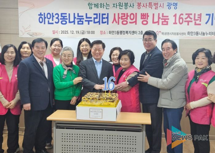 뉴스팍 배상미 기자 | 광명시 하안3동 나눔누리터는 광명시자원봉사센터, 하안3동 행정복지센터와 함께 지난 19일 하안3동 행정복지센터 2층 회의실에서 ‘사랑의 빵 나눔’ 16주년 기념식을 개최했다.