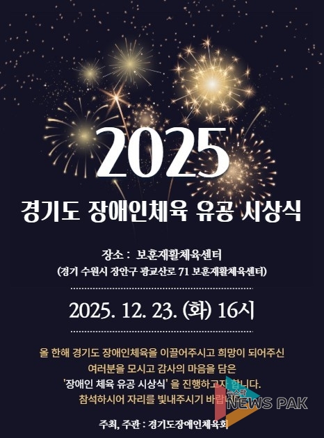 경기도장애인체육회는 오는 23일 오후 4시 수원시 장안구 보훈재활체육센터 체육관에서 ‘2025년 경기도 장애인체육 유공 시상식’을 개최한다고 밝혔다. 이번 시상식은 한 해 동안 장애인 체육 저변 확대에 힘쓴 유공자들의 공로를 기리고, 전국대회 5연패라는 금자탑을 쌓은 선수단의 노고를 치하하기 위해 마련됐다.