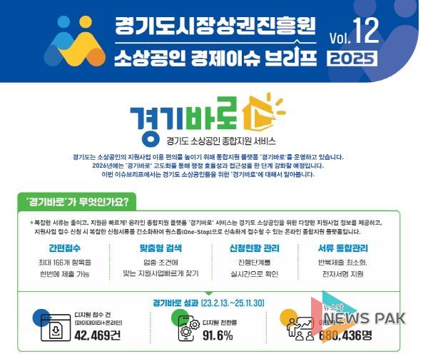 뉴스팍 배상미 기자 | 경기도시장상권진흥원은 22일, 도내 소상공인의 행정 편의와 정보 접근성을 높이기 위해 운영 중인 경기도 소상공인 종합지원 서비스 ‘경기바로’의 현황과 향후 개선 방향을 담은 「경기도 소상공인 경제 이슈 브리프 VOL.12」을 발간했다고 밝혔다.