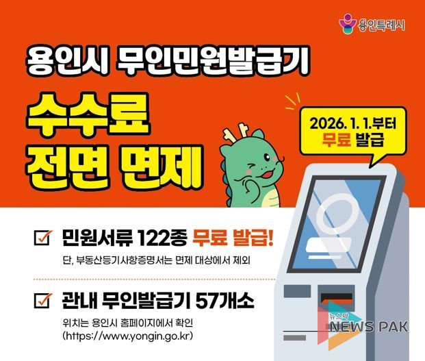 뉴스팍 배상미 기자 | 용인특례시는 2026년 1월 1일부터 지역 내 설치된 무인민원발급기에서 발급되는 민원서류 수수료를 전면 면제한다고 25일 밝혔다.