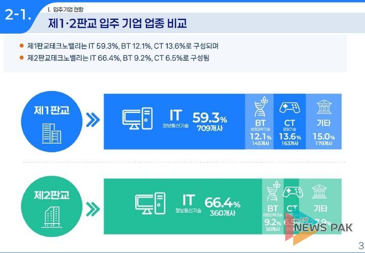 제1판교는 1,196개 기업이 입주해 전년 대비 4% 감소했으나, 제2판교는 584개 기업으로 4% 증가했다. 업종별 구성은 정보기술(IT)이 전체의 61.5%로 가장 높은 비중을 차지했고, 바이오기술(BT)과 문화기술(CT)이 각각 11%로 뒤를 이었다. 기업 규모별로는 중소기업이 85%로 높은 비중을 나타냈으며, 중견기업은 9.3%, 대기업은 3.7%로 나타나 중소기업 중심의 혁신 생태계가 유지되고 있음을 확인했다.