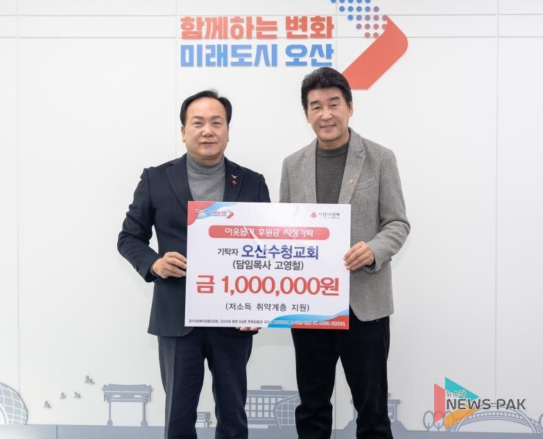 뉴스팍 이소율 기자 | 오산시는 지난 26일 오산수청교회가 희망2026나눔캠페인에 동참해 관내 취약계층 지원을 위한 성금 100만 원을 기탁했다고 밝혔다.