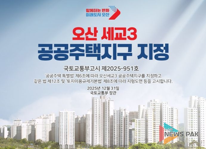 뉴스팍 이소율 기자 | 오산시는 31일 국토교통부가 오산 세교3 공공주택지구의 지구지정 고시를 완료했다고 밝혔다. 경제자족형 미래도시를 향한 청신호가 켜진 셈이다.