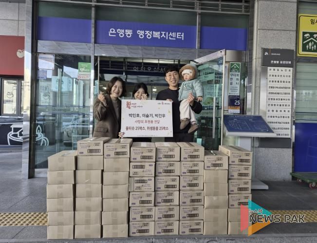 뉴스팍 배상미 기자 | 시흥시 은행동 행정복지센터에 지난 12월 30일 한 부부가 세 살 자녀와 함께 방문해 관내 영유아와 청소년을 위한 물티슈 및 위생용품 50상자를 기탁했다.