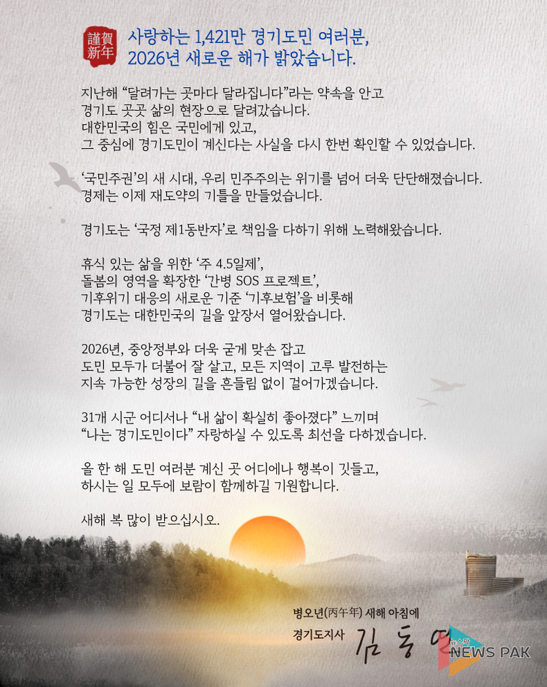 뉴스팍 배상미 기자 | 김동연 경기도지사가 2026년 병오년(丙午年) 새해를 맞아 1,421만 경기도민에게 희망의 메시지를 전하며, 경기도가 대한민국의 혁신과 성장을 이끄는 ‘국정 제1동반자’로서의 역할을 더욱 강화하겠다는 포부를 밝혔다.