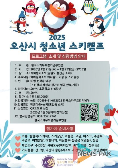 뉴스팍 이소율 기자 | 오산시는 관내 초등학교 4~6학년 학생을 대상으로 겨울방학 기간 체험형 야외활동 기회를 제공하기 위해 ‘2026년 오산시 청소년 겨울 스키캠프’를 운영한다고 밝혔다.