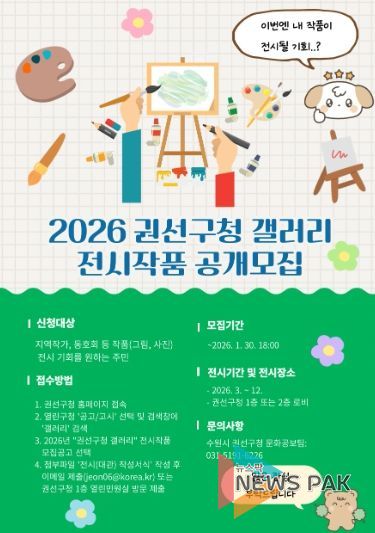 뉴스팍 배상미 기자 | 수원시 권선구는 1월 30일까지 2026년 권선구청 갤러리 전시작품을 공개모집한다.
