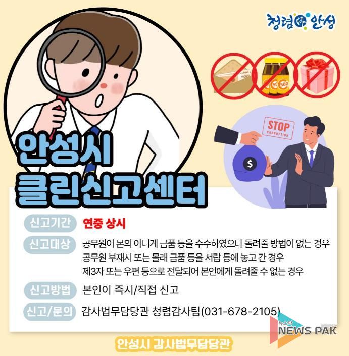 뉴스팍 배상미 기자 | 안성시는 시민들에게 신뢰받는 공정하고 투명한 행정 서비스를 제공하기 위해 ‘클린신고센터’를 연중 상시운영하며 청렴한 행정문화 정착에 힘쓰고 있다고 밝혔다.