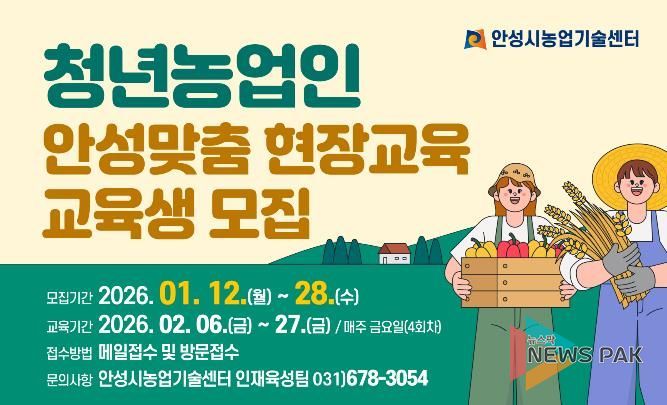 뉴스팍 배상미 기자 | 안성시농업기술센터는 농업을 희망하는 청년층의 진입 장벽을 낮추고 기존 청년농업인의 현장 적응을 돕기 위해 ‘청년농업인 안성맞춤 현장교육’ 교육생을 모집한다고 밝혔다.