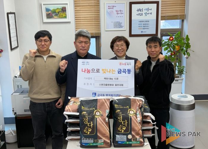 수원자율방범대 칠보지대는 13일 금곡동 행정복지센터를 방문해 백미 10kg 15포를 전달하며 지역 내 어려운 이웃을 위한 나눔을 실천했다.